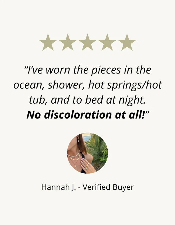 Each piece is waterproof, sweatproof, hypoallergenic, tarnish-free, and cosmetic-friendly.